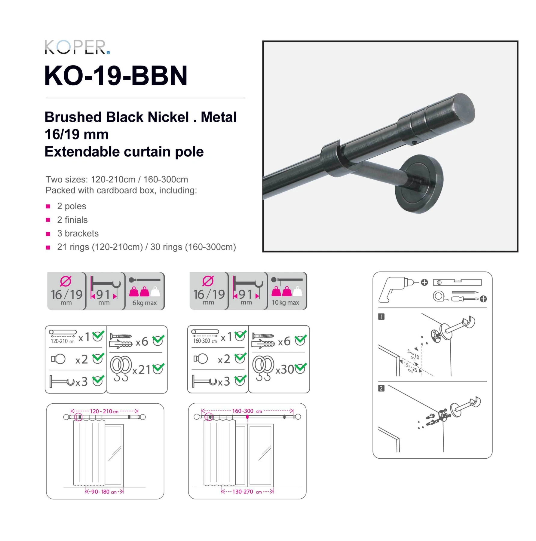 160-300CM BRUSHED BLACK NICKEL - small round - 16/19mm