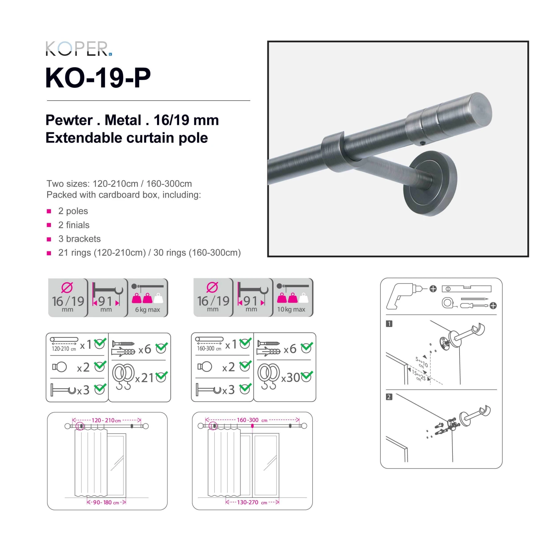 160-300CM PEWTER - small round pole - 16/19mm